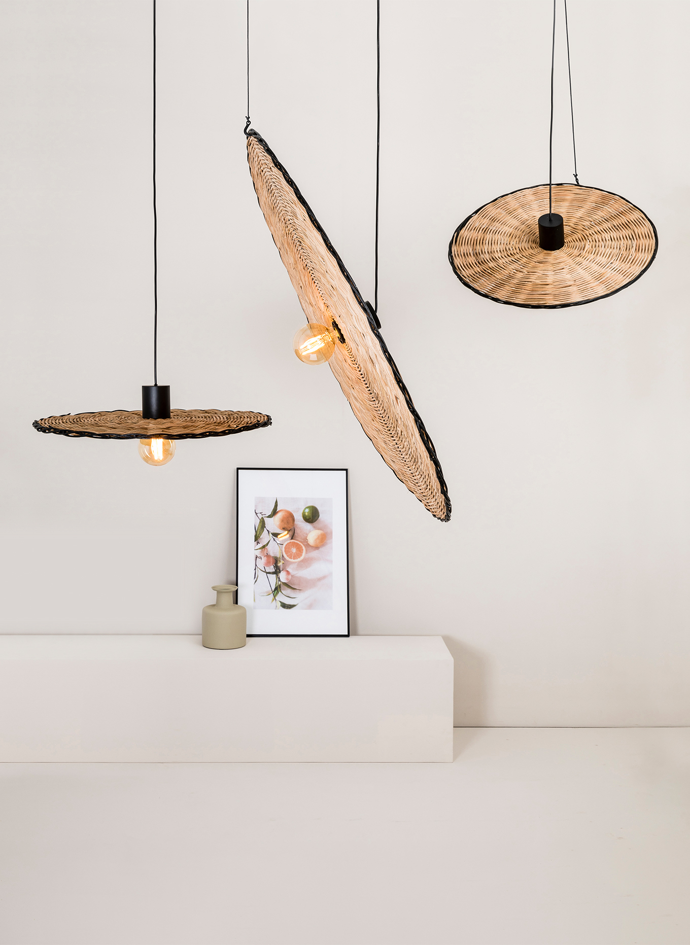 Pendelleuchte: LX Costo II Eigenschaften: 1x E27, max. 15W Textilkabel 1500mm Farbe: Natur/Schwarz Maße: D 1000mm Material: Rattan/Metall Mit Aufbaubaldachin/Einbaubaldachin/3-Phasenadapter auf Anfrage