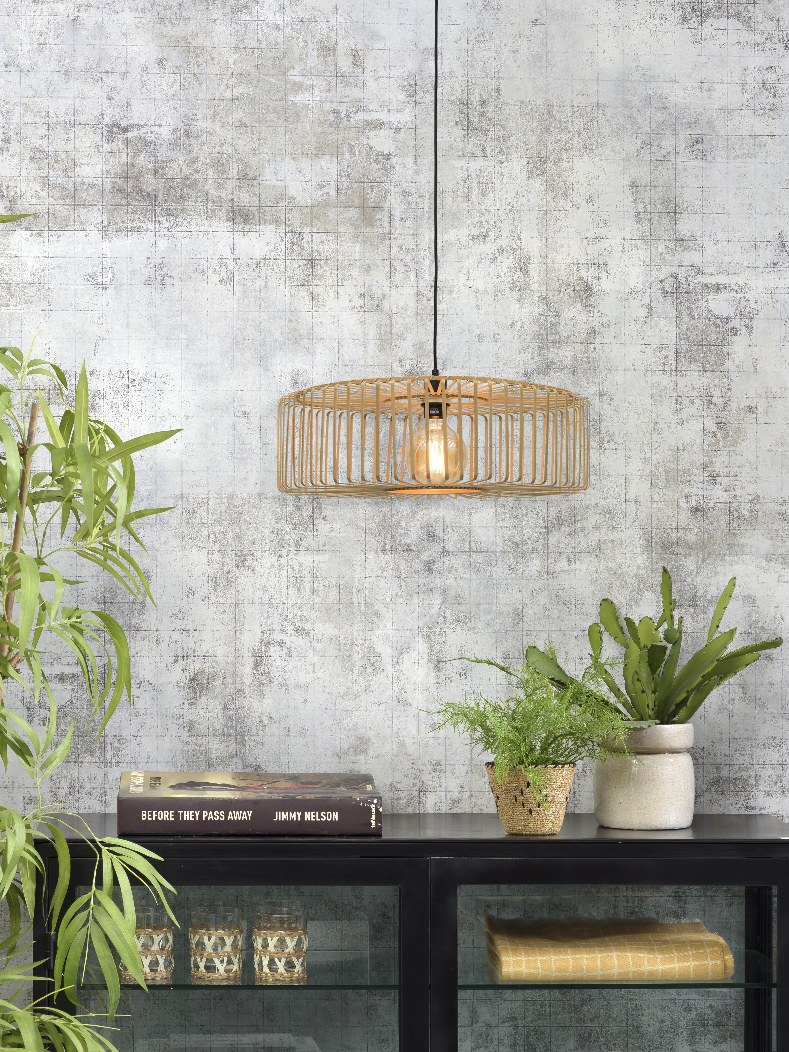 Pendelleuchte: LX Romo I Eigenschaften: 1xE27 Textilkabel Schwarz 2, 5m Farbe: Natur Maße: D 400mm H 180mm Material: Bambus/ Metall Mit Aufbaubaldachin/Einbaubaldachin/3-Phasenadapter auf Anfrage