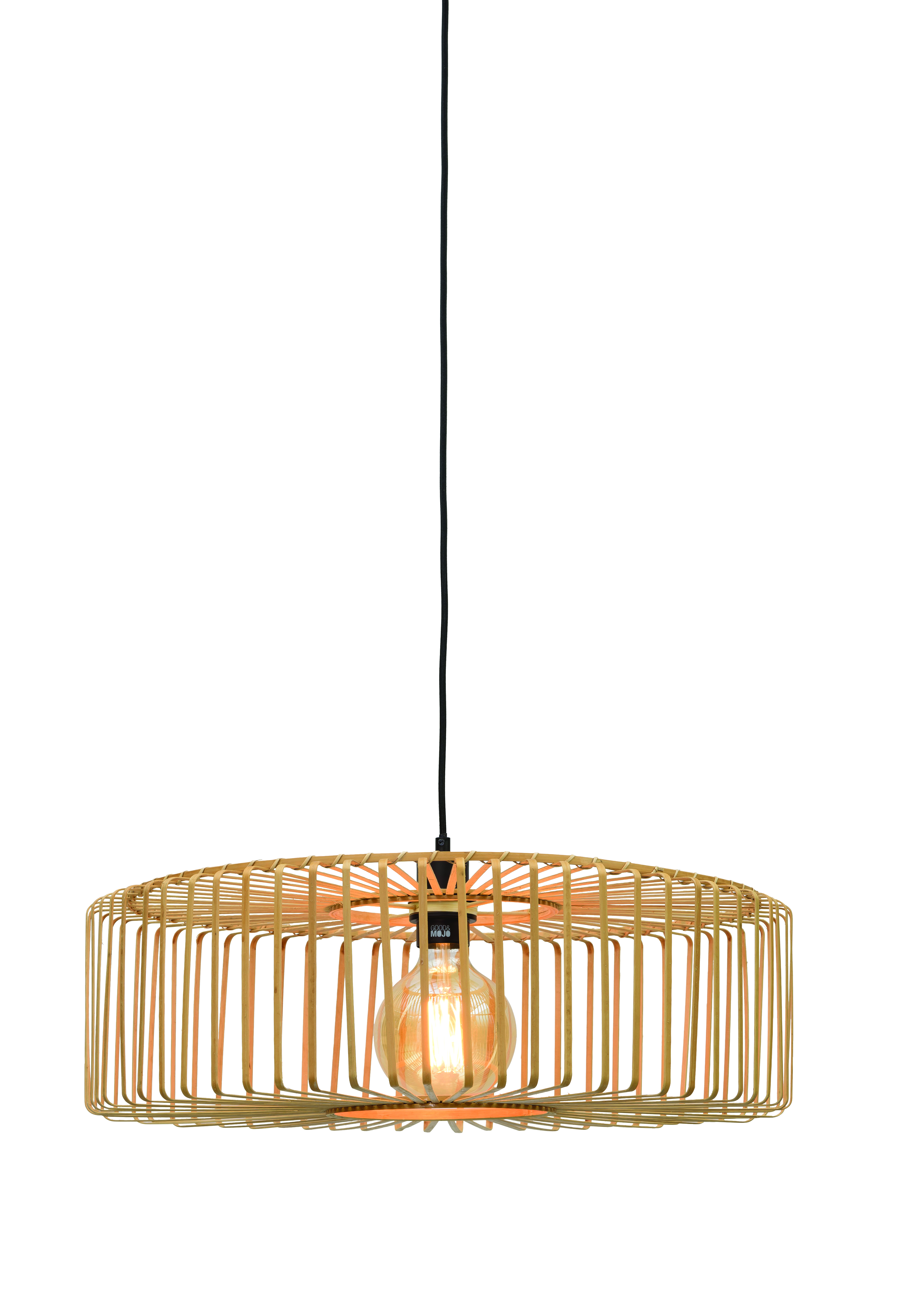 Pendelleuchte: LX Romo II Eigenschaften: 1xE27 Textilkabel Schwarz 2,5m Farbe: Natur Maße: D 600mm H 180mm Material: Bambus/ Metall Mit Aufbaubaldachin/Einbaubaldachin/3-Phasenadapter auf Anfrage